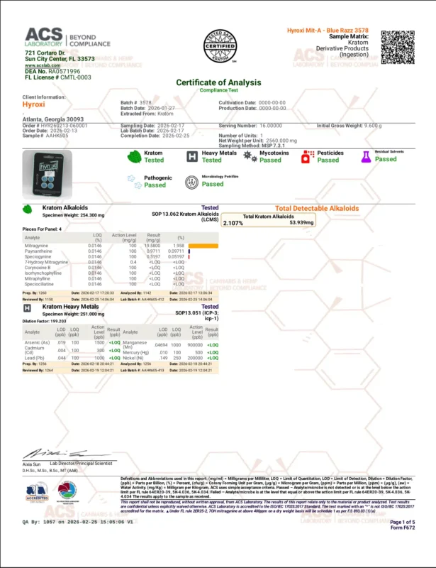 All Hyroxi Zero 7-OH products are tested to confirm non-detectable levels of 7-Hydroxymitragynine, verified as below the laboratory limit of quantification (LOQ).